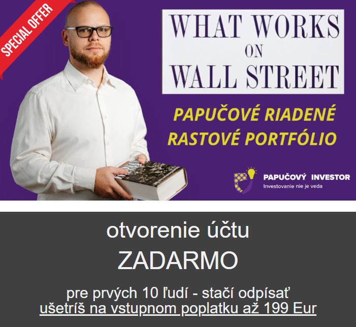 Ak hľadáš rastové portfólio, ktoré by bolo silnou a potenciálne výnosnejšou alternatívou nie len k pasívnemu ETF portfóliu, určite sa zamysli nad naším novým Papučovým riadeným rastovým portfóliom. Viac informácií a záznam z nášho kickoff online webinára zo 7.11.2024 si môžeš prejsť priamo na našej podstránke, ktorá je určená pre všetkých našich potenciálnych investorov, ktorý preferujú možnosť len "poslať peniaze a viac sa nestarať". Otvoriť účet online zvládneš už za 15 minút cez svoj PC a ak nechceš platiť administratívny poplatok 199 Eur, stačí keď sa nám ozveš cez náš kontaktný formulár pred samotným otvorením účtu.