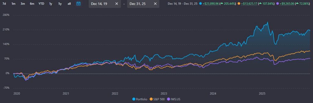Netušíme, koľko bude naše portfólio zarábať do budúcnosti. O čo sa vieme oprieť, je naša 5 ročná história (kde náš výnos p.a. bol viac ako 3 percentuálne body nad výnosom S&P 500) a dlhodobé štatistiky podobných faktorových investícií, ktoré hovoria, že investície zamerané na faktory „value“ a momentum“ majú už v 7 ročnom horizonte viac ako 95% šancu porazenia širokého trhu a priemerný ročný nadvýnos je v tomto horizonte 4-5 percentuálnych bodov (zdroje: J.P. O’Shaughnessy: What Works on Wall Street; E. Fama / K. French: Common risk factors in the returns on stocks and bonds.) Na základe týchto našich skúseností a historických dát a štúdií máme primeranú dôveru, že naša investičná stratégie obstojí v konkurencii pasívnych ETF portfólií aj v prípade predĺženia časového testu.